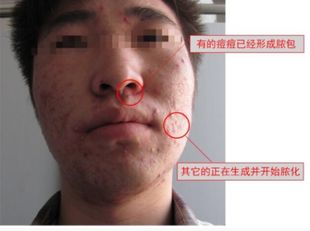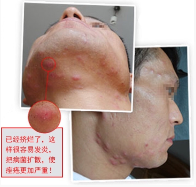 他的照片可以看出长痘的严重性已经很明显,像这种痘痘的根基在皮肤层不是很深,但是非常容易留痘印。长脓痘经常挤,这不能彻底解决问题,感染后红印会很难去掉,随着长成的密度相对过密,还有很多小痘没起来。继续挤下去只会皮损更严重,一旦引起周边感染,创伤面积会持续加大,痘印就会比较多。