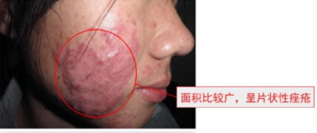你现在看到这位小姐得的就是片状囊肿型痘痘,是最为严重的一种痘。这种痘往往容易聚集融合发展成壁厚的结节。还有更糟糕的一种状况,就是损害破坏真皮层腺体,可以引起纤维性变及萎缩,导致皮损严重形成永久性痘坑。