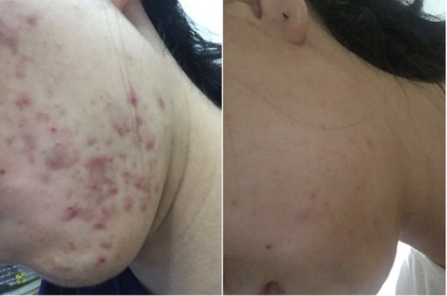 邱小姐是典型的激素痘,之前长痘病急乱投医,自己胡乱购买各种含激素的祛痘药膏,痘痘更加严重,形成激素脸。这种肌肤需要做减法,首先我让她停用自己在用的所有护肤品,不化妆不熬夜,忌口,每天坚持补水,再用我的方法进行修复,皮肤炎症逐渐减轻,毒素排出,现在痘痘根除,皮肤就恢复健康状态,没有复发。