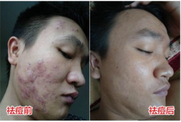张先生,30多岁,他说已经长了十几年,而且反复连续的长,有时还会长在鼻子和耳朵里面,苦不堪言。用了很多的祛痘产品都没效果,痤疮常长在下巴位置,刮胡须时都会碰到,不小心就会弄出血。现在下巴,两腮都有了痘坑,还有些皮肤凹凸不平。 他也服用过中药,中医说他可能肝火旺、湿热引起,已经开了很多中药服用,后来也是不见好转。他爱人也想再要个小孩,就没再煲中药,怕毒副作用大,就把中药断了。他希望可以尽快解决这问题。